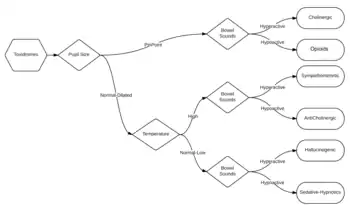 A toxidrome (a portmanteau of toxic and syndrome, coined in 1970 by Mofenson and Greensher[2]) is a syndrome caused by a dangerous level of toxins in the body. It is often the consequence of a drug overdose. Common symptoms include dizziness, disorientation, nausea, vomiting and oscillopsia. It may indicate a medical emergency requiring treatment at a poison control center. Aside from poisoning, a systemic infection may also lead to one. Classic toxidromes are presented below, which are variable[1] or obscured by co-ingestion of multiple drugs.[3]