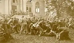The classes of 1877 and 1876 began the tradition of holding annual "Olympic Games," where the freshman and sophomore classes would compete in various athletic events at the Old Fairgrounds.[7] The opening ceremonies included partisan bands and the smoking of a "Pipe of Peace."[8] During the 1881 Olympic Games, the competitions included the rope pull, the 100 yard dash, hop skip and jump, potato sack races, throwing of a base ball, 220 yard race, high jump, hurdle race, long jump, Indian wrestling, three legged race, 2 mile race, "scratch", and football.[8] Traditionally, the competitors employed "ruses" to influence the officiating.[8] These games eventually fell out of favor, as only 15 students from each class would participate.[8] Instead, the student body preferred the "Field Days" tradition, a campus-wide student athletic campus-wide athletic festival run entirely by students, where all could participate.[8][9]