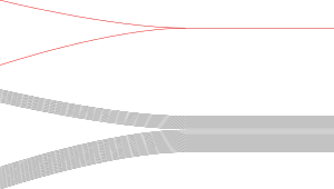 A switch in a train track models a point where two families of parallel curves in the lamination merge to become a single family, as shown in the illustration. Although the switch consists of three curves ending in and intersecting at a single point, the curves in the lamination do not have endpoints and do not intersect each other.