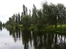 The canals of Lake Xochimilco were initially created along with artificial agricultural plots called chinampas. Chinampas were invented by the pre-Hispanic peoples of the region around 1,000 years ago as a way to increase agricultural production. On the shallow waters of the lakes, rafts were constructed of juniper branches. Onto these rafts floating on the water, lakebed mud and soil were heaped and crops planted. These rafts, tied to juniper trees, would eventually sink and a new one be built to replace it. Over time, these sunken rafts would form square or rectangular islands, held in place in part by the juniper trees. As these chinampa islands propagated, areas of the lake were reduced to canals. These “floating gardens” were an important part of the economy of the Aztec Empire by the time the Spanish arrived.[33][34][35] Today, only about 5,000 chinampas, all affixed to the lake bottom, still exist in their original form, surrounded by canals and used for agriculture. The rest have become solid ground and urbanized. In the center of Xochimilco, there are about 200 chinampas, covering an area of 1,800 hectares. However, one reason the number has decreased is that smaller chinampas have been combined to create larger ones.[31] While there are still those who maintain chinampas traditionally, and use them for agriculture, the chinampa culture is fading in the borough, with many being urbanized or turned into soccer fields and sites for housing and businesses.[28] The deterioration of many of these chinampas can be seen as their edges erode into the dark, polluted water of the canals.[34] The most deteriorated chinampas are located in the communities of Santa María Nativitas, Santa Cruz Acalpixca, San Gregoria Atlapulco, and Ejido de Xochimilco. Together, these have a total of thirty eight illegal settlements. To repair a number of chinampas, the borough, along with federal authorities, has reinforced 42 km (26 mi) of shoreline, of the 360 km (220 mi) that exist in the lake area. This involves the planting of juniper trees and the sinking of tezontle pylons into the lakebed.[28] These remaining chinampas are part of the Xochimilco World Heritage Site.[34] Have since changed use and become residences and businesses. Those that remain agricultural are mostly used as nurseries, growing ornamental plants such as bougainvilleas, cactuses, dahlias, day lilies, and even bonsai.[36] As they can produce up to eight times the amount of conventional land,[11] they are still an important part of the borough's agricultural production.[34] There have been various attempts to save the remaining chinampas, including their cataloging by UNESCO, UAM, and INAH in 2005, and various reforestation efforts, especially of juniper trees.[22][31]
