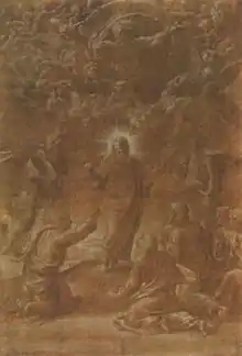 Raphael would have been familiar with the final form of The Raising of Lazarus as early as the autumn of 1518, and there is considerable evidence that he worked feverishly to compete, adding a second theme and nineteen figures.[3] A surviving modello for the project, now in the Louvre (a workshop copy of a lost drawing by Raphael's assistant Gianfrancesco Penni) shows the dramatic change in the intended work.