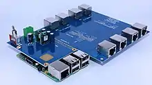 The TART contains four radio hubs. Each has six RF front end receivers and clock distribution circuitry. Each radio hub sends data to the basestation, and receives the master clock signal from the basestation, over two standard Cat 6 twisted-pair ethernet cables.