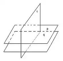 Plane "t" is a transversal plane because it intersects parallel planes "p" and "q".