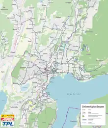 TPL operates the city's urban bus network, along with a funicular that links the city's railway station with the city centre. It is a private limited company whose shares are mostly owned by the city of Lugano (58.56%) and the canton of Ticino (30.44%), with the remaining shares are owned by neighbouring municipalities. It is a member of the arcobaleno tariff network.[2]