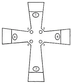 The Cross of the Field, also known as the Cross of the Oriflamme, is a Greek cross with arms slightly expanded at the ends, with an extension on the lower arm making it a Latin cross. It is 42 centimeters high, 28.5 centimeters wide and 5 centimeters thick, consisting of a walnut wood core entirely covered with pure silver foil with gilded silver edges attached by pegs.[8] On one side the arms are connected by a disk, on the other by short diagonal strokes. The whole is adorned with set gems and figures worked in high relief in the silver foil.