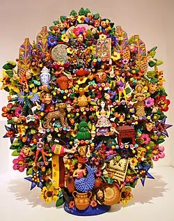 A Tree of Life (Spanish: Árbol de la vida) is a type of Mexican pottery sculpture traditional in central Mexico, especially in the municipality of State of Mexico. Originally the sculptures depicted the Biblical story of creation, as an aid for teaching it to natives in the early colonial period. The fashioning of the trees in a terracotta sculpture began in Izúcar de Matamoros, Puebla but today the craft is most closely identified with Metepec.[1] Traditionally, these sculptures are supposed to consist of certain biblical images, such as Adam and Eve, but recently there have been trees created with themes completely unrelated to the Bible.[2]