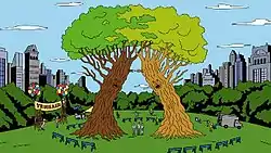 "Treegasm" is the fifth episode of the first season of the American animated television series Ugly Americans. which aired on Comedy Central in the United States on April 14, 2010. In the episode, Mark meets a pair of tree creatures who are expected to participate in a public mating ritual sanctioned by New York City as a festival. Meanwhile, Callie demands to have sex with Mark to ease the pain from her shedding, and Randall loses his penis after visiting a movie theater.