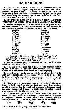 Below are pages from a U.S. Army World War I trench code, an edition designated as "Seneca:"[1]: pp.185–188