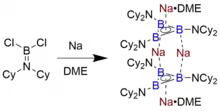 The sole isolable example of a triboracyclopropenyl anion that persists in solution and in the solid state was identified by Braunschweig and coworkers, who synthesized it by reducing the aminoborane Cl2B=NCy2 (Cy = cyclohexyl) with finely dispersed sodium metal in dimethoxyethane (DME).[7] Cooling of the resulting orange-red solution of the dimeric species Na4[B3(NCy2)3]2 • 2 DME resulted in crystals suitable for X-ray diffraction, by which the structure was determined. Although the detailed reduction mechanism is unknown, it has been suggested that subvalent "R2N−B" intermediates are involved in the formation of such boron clusters.[12]