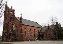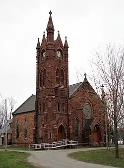 Trinity Episcopal Church is a historic Episcopal church located at Potsdam in St. Lawrence County, New York. It was built in 1835 in the Federal style with Gothic elements built of red Potsdam Sandstone. It was greatly enlarged and transformed into High Victorian Gothic style later in the 19th century, with less significant alterations continuing into the 20th century. The front facade of the church took its final form in 1886 and is a lavishly decorated Victorian Gothic creation, made possible by donations from Thomas S. Clarkson and his family.[2] It features a 110-foot-tall (34 m), 19-by-19-foot (5.8 by 5.8 m) four-level tower. Also on the property is a stone wall dating to 1870, a large cast iron urn dating to about 1880 and a cast iron lamppost on a sandstone base dating to 1880.[3]