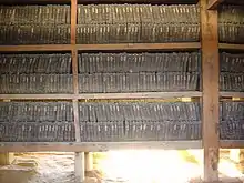 Each wood block (page) measures 24 centimetres in height and 70 centimetres (9.4 in × 27.6 in) in length.[3] The thickness of the blocks ranges from 2.6 to 4 centimetres (1.0–1.6 in) and each weighs about three to four kilograms (6.61 - 8.81 lbs). The woodblocks would be almost as tall as Mount Baekdu at 2.74 km (1.70 mi) if stacked and would measure 60 km (37 mi) long if lined up, and weigh 280 tons in total.[4] The woodblocks are in pristine condition without warping or deformation despite being created more than 750 years ago.[5][6] The Tripiṭaka Koreana is stored in Haeinsa, a Buddhist temple in South Gyeongsang Province, in South Korea.