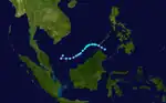 The monsoon trough produced another disturbance that upgraded into a tropical depression to the west of Luzon on June 29. The tropical depression tracked northwestward while a subtropical ridge influenced the depression and caused it to upgrade to Tropical Storm Durian on June 30.[17] The storm attained severe tropical storm status at 18:00 UTC the same day,[13] with 10-minute winds of 110 km/h (70 mph) and 1-minute winds of 140 km/h (85 mph), making it equivalent to Category 1 winds on the Saffir–Simpson scale.[17] Durian had an atmospheric pressure of 970 hPa (29 inHg).[13] Durian made landfall on the Leizhou Peninsula,[13] before rapidly weakening as it continued in the same direction before the JTWC stopped advisories of the storm on July 2,[11] with the JMA doing the same the following day.[13]