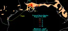 The storm dropped heavy rainfall in Louisiana, which peaked at 10.25 inches in Norwood. Storm tides were generally 1 to 2 feet (0.30 to 0.61 m) above normal, while the mouth of the Bayou Dupre recorded a storm tide of 3.79 feet (1.16 m).[2] The rainfall led to flash flooding in places, and also a few overflowed rivers in St. Tammany Parish.[13] The flooding covered several roadways[14] and bridges, and entered a few businesses and houses in East Feliciana Parish.[15] Damage in Louisiana totaled to $150,000 (2002 USD, $180,000 2008 USD).[13][14][15][16]