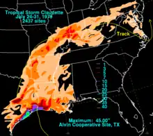Claudette produced torrential rains in both Texas and Louisiana when it made landfall. The highest one-day total was reported near Alvin, Texas where 42 inches (1,100 mm) of rain fell. This remained as the highest twenty-four-hour rainfall record for any location in the United States until the 2018 Kauai floods, when 49.69 inches (1,262 mm) of rain fell in 24 hours in Waipā Garden, Kauai, Hawaii.[6] Two other towns also reported rainfall totals exceeding 30 inches (760 mm).[7] There was only one death from drowning and Louisiana received only minor damage from up to 15 inches (380 mm) of rainfall.[8] Texas was hard hit by Claudette, with flooding reported in southeast Texas from up to 45 inches (1,100 mm) of rainfall. Many residents had to be rescued from low-lying areas that were flooded.[9]