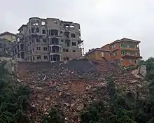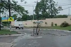 The disaster affected 507,831 people on the island; it resulted in 16 deaths—14 confirmed—and 42 injuries.[35] In Saint Andrew Parish's Sandy Park, a house next to a street gully succumbed to the effects of the storm; five bodies were recovered near the site, while the final missing inhabitant was presumed dead.[37][38] Elsewhere in Saint Andrew, three construction workers were killed when the shed in which they were sleeping collapsed.[39] A girl was crushed to death under the weight of a collapsed board house in Saint Catherine Parish.[40] Rushing waters swept away three people in different parts of the island.[41][42] Amid a microburst, a waterspout tore roofs off buildings and hospitalized five residents in Westmoreland Parish's capital of Savanna-la-Mar,[35][43] while to the northwest, strong gusts and rough surf impacted the resort town of Negril.[44] In the wake of the storm, a body was recovered from debris along a road in Saint Catherine.[45] Flooded streets, roads, and bridges isolated communities across seven of the island's parishes and trapped hundreds of residents in their homes.[46][47]
