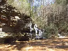 Trough Creek State Park is in the southern section of the Ridge and Valley region of Pennsylvania. Great Trough Creek carved a valley through the Broad Top in the Appalachian Mountains, which have been greatly reduced in size by the effects of wind and water erosion.[7] The bedrock formations within the park are (in ascending stratigraphic order): Devonian Catskill Formation, the Mississippian-Devonian Rockwell Formation, and the Mississippian Pocono Formation.[8]