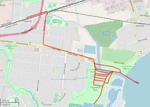 The 610 mm (2 ft) narrow-gauge tramway line began at Laverton railway station and ran along what are now Merton Street and Queen Street through the Truganina Explosives Reserve and then to a jetty at Laverton Creek on Altona Bay.[1][3] It had eight passing loops parallel to the mainline at the storage facility, as well as sheds and dead-end sidings at Laverton station.[3]