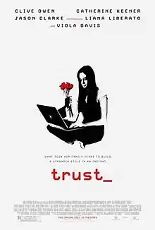 Trust (stylized as trust_) is a 2010 American drama thriller film directed by David Schwimmer and written by Andy Bellin and Robert Festinger, based on an uncredited story by Schwimmer. Starring Clive Owen, Catherine Keener, Jason Clarke, Liana Liberato, and Viola Davis, the film follows a fourteen-year-old girl who becomes a victim of sexual abuse after meeting a man posing as a teenage boy on an online chat room.