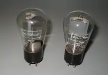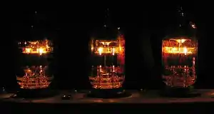 Tube sound (or valve sound) is the characteristic sound associated with a vacuum tube amplifier (valve amplifier in British English), a vacuum tube-based audio amplifier.[1] At first, the concept of tube sound did not exist, because practically all electronic amplification of audio signals was done with vacuum tubes and other comparable methods were not known or used. After introduction of solid state amplifiers, tube sound appeared as the logical complement of transistor sound, which had some negative connotations due to crossover distortion in early transistor amplifiers.[2][3] However, solid state amplifiers have been developed to be flawless and the sound is later regarded neutral compared to tube amplifiers. Thus the tube sound now means 'euphonic distortion.'[4] The audible significance of tube amplification on audio signals is a subject of continuing debate among audio enthusiasts.[5]
