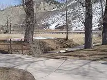 The town of Tucker was located near a sharp curve at the bottom of a 5% grade along U.S. Route 6. In 2009, the Utah Department of Transportation closed and buried the Tucker rest area to build a safer alignment, with a banked curve and reduced grade. In 2010, the department dedicated a replacement rest area about 2 miles (3.2 km) downstream from Tucker (mile post 202).[6] The structure was named the Tie Fork Rest Area after the side canyon where it was located.[7] The replacement rest area was designed to mimic an early 1900s era train depot to honor the town, including a replica roundhouse and non-functional steam locomotive built by Original Creations of Carbonville, Utah.[6][8][9] The buildings were designed by the Archiplex Group of Salt Lake City.[9] The rest area was voted one of the most beautiful buildings in the state of Utah in a contest sponsored by the American Institute of Architects.[10] It is also one of the busiest non-freeway rest areas in the state.[11]
