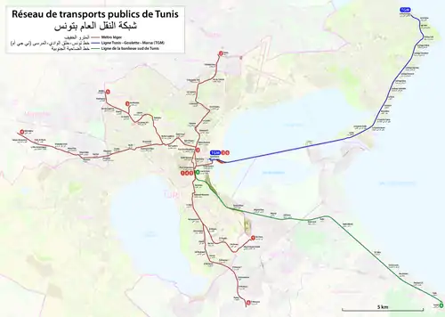 The Tunis Metro (Tunis light metro, also Tunis light rail, Tunisian Arabic: المترو الخفيف لمدينة تونس, el-metrū el-khfīf li-mdīnat tūnis) is an expanding public transportation network for the Tunis metropolitan area that began operation in 1985. It is a light rail system.