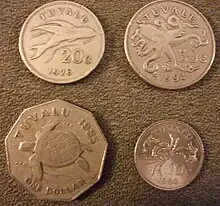The Tuvaluan dollar is one of the currencies of Tuvalu, whose unofficial international currency code is TVD.[1] Tuvalu has never had banknotes of its own, and has been issuing coins since 1976. However, the Tuvaluan dollar is used as a unit of account, and is pegged to the Australian dollar (the other currency of Tuvalu) at parity. From 1966 to 1976, Tuvalu officially used the Australian dollar. In 1976, Tuvalu began issuing its own coins, which continue to circulate alongside Australian coins. Tuvalu continues to use Australian banknotes. Tuvaluan coins are not legal tender in Australia. Similar to the Faroese króna's relationship to the Danish krone and the Panamanian balboa's relationship to the United States dollar, the Tuvaluan dollar is not an independent currency, but a variation of the Australian dollar.