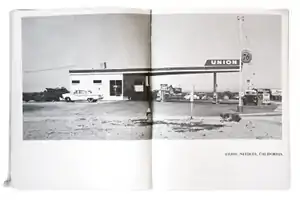 Twentysix Gasoline Stations is the first artist's book by the American pop artist Ed Ruscha. Published in April 1963[1] on his own imprint National Excelsior Press,[2] it is often considered to be the first modern artist's book,[3] and has become famous as a precursor and a major influence on the emerging artist's book culture, especially in America.[4] The book delivers exactly what its title promises, reproducing 26 photographs of gasoline stations next to captions indicating their brand and location. From the first service station, 'Bob's Service' in Los Angeles where Ruscha lived, the book follows a journey back to Oklahoma City where he had grown up and where his mother still lived. The last image is of a Fina gasoline station in Groom, Texas, which Ruscha has suggested should be seen as the beginning of the return journey, 'like a coda'.[5]