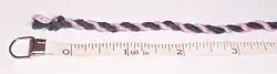 The number of twists per inch can, in plied yarns, be determined by counting the number of bumps in one inch, and dividing that number by the number of singles (the strands plied together to make the yarn).[2] If the adjacent picture, for example, was of an inch of two ply yarn, then the number of twists per inch would be 6 divided by 2, or three, as there are six bumps, and it is a two ply.