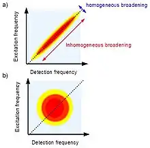 Thanks to the high spectral resolution, this technique acquires information based on the two dimensional shape of the peaks. When is close to zero the diagonal peaks show an elliptical lineshape as is shown in the figure on the right.[9] The width along the diagonal line represents the inhomogeneous broadening which contains information about interactions between the environment and the system. If the system is composed of a large amount of identical molecules, each of them interacts with the environment in a different way; this implies that the same electronic state of each molecule assumes different small variations. The value of the linewidth will be close to the one calculated in the linear absorption spectrum. On the other hand, the linewidth along the off-diagonal shows a smaller value with respect to the diagonal one. In this case the spectral broadening contains a contribution from a local interaction inside of the system; for this reason, the width reflects the homogeneous broadening.[5]