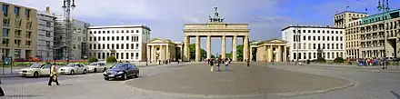 The new 180 million euro Embassy building, conceptualized in 1996 by Moore Ruble Yudell, has its main entrance facing north towards the Pariser Platz. Its eastern side abuts an existing bank building, and the west side of the land faces Ebertstraße. The south side also faces a street, towards the German Holocaust memorial. Pariser Platz has the Brandenburg Gate at its western entrance. The small Haus Sommer building, also housing a bank, is in between the northwest corner of the new U.S. Embassy and the Brandenburg Gate. Close to the Pariser Platz and the new embassy is the Reichstag building, home to the German Bundestag. Located on Pariser Platz, or on the same city blocks that surround Pariser Platz are the French and British embassies as well as the Hotel Adlon. With the exception of the Brandenburg gate, which was heavily damaged in World War II, all other former structures that surrounded Pariser Platz were destroyed during the war, or were demolished by the East German government by about 1960. From 1960 through German Reunification in 1990, Pariser Platz held only open fields on both sides of the major boulevard Unter den Linden. In 1992, the governments decided that a new American embassy building would be built on the site, and in 1993 a memorial announcing these plans was placed in the open field.