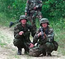 The U.S. Woodland is a camouflage pattern that was used as the default camouflage pattern issued to the United States Armed Forces from 1981, with the issue of the Battle Dress Uniform, until its replacement in the mid to late 2000s.[1] It is a four color, high contrast disruptive pattern with irregular markings in green, brown, sand and black. It is also known unofficially by its colloquial moniker of "M81" after the Battle Dress Uniform it was first used on,[2] though this term was not officially used by the U.S. military.