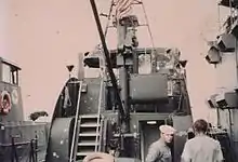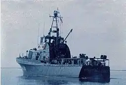 In April 1965, at the request of the United States Navy, she was tasked for service in South Vietnam and assigned to Coast Guard Squadron One in support of Operation Market Time, along with 16 others of her class.[12][13] While the crew completed overseas training and weapons qualifications at Coast Guard Island and Camp Parks, California, Point Welcome was loaded onto a merchant ship, and transported to Subic Bay, Philippines in May 1965. She was refitted for combat service with the installation of single-sideband radio, additional floodlights, phone circuits and four M2 machine guns.[5] The original bow-mounted machine gun was replaced with a combination over-under .50 caliber machine gun/81mm trigger-fired mortar, developed by the Coast Guard for service in South Vietnam.[4][5][14][15] For service in Vietnam, two additional commissioned officers were added to the crew to add seniority in the mission of interdicting vessels at sea.[16]