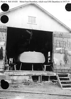 ![]() A stern view of Dauntless as a private motorboat in a boat house – possibly that of her builder, W. Frank Harrison of Essex, Connecticut – ca. 1917, prior to her United States Navy service. | |