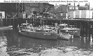 ![]() USS Elsie III (foreground) at Lockwood's Basin in Boston, Massachusetts, during World War I. Behind her is the patrol vessel USS Lynx II (SP-730). | |