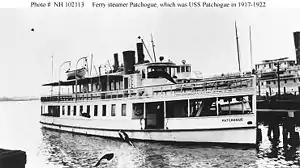 Patchogue was built in 1912 as a commercial wooden-hulled steam ferry of the same name by Robert Jacobs at City Island in the Bronx, New York. In 1917, the U.S. Navy purchased her from the Boston, Nahant and Pines Steamship Company for use during World War I. Delivered to the Navy on 29 September 1917 and assigned the naval registry identification number 1227, she entered service as USS Patchogue (ID-1227).