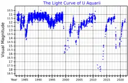 U Aquarii, abbreviated U Aqr, is a variable star in the equatorial constellation of Aquarius. It is invisible to the naked eye, having an apparent visual magnitude that ranges from 10.6 down to as low as 15.9.[3] Based on parallax measurements, the distance to this star is approximately 38 kly (12 kpc). In 1990, W. A. Lawson and associates provided a distance estimate of 43 kly (13.2 kpc) based on the assumption of a bolometric magnitude of −5.[5] It appears to lie several kiloparsecs below the galactic plane, and thus may belong to an old stellar population.[4]