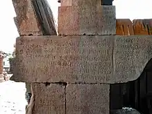 Directly east of Nīlakaṇṭheśvara is a large palace complex known as Shāhī Maḥal, which served as the residence of the local governor during the Mughal rule.[11] Built on a rectangular plan, the maḥal has four corner towers and a two-storey elevation, with a suite of rooms disposed around two interlinked courtyards, all decorated in the simple and elegant stonecarving style of the 17th century. The existing ruins retain traces of excellent stone jālī work. Forming an adjunct of the maḥal is a big mosque, an imposing edifice locally known as Shāhī Masjid or Qāḍiyon-kī-Masjid.[11][12] A Persian inscription carved on a slab measuring 65 x 42 cm, affixed on the central mihrab of the mosque, records its foundation by Qāḍi Awliyā b. Sayyid ʿAbd al-Ṣamad al-Ḥasanī on 4 Rajab 1026 Hijrī, or 28 June 1617 CE, at the time when Emperor Jahāngīr was on a visit to Mandu.[12] A second Persian inscription carved on a slab measuring 4'1" x1', in a balcony projecting from the north wall of the mosque records that the mosque was only half complete when both king and qāḍi passed away, and that it was finally completed by Sayyid Ḥāmid and Sayyid Dāʾūd, sons of Qāḍi Awliyā, on 10 Dhū'l-Ḥijja 1041 Hijrī, or 18th June 1632 CE, during the reign of Emperor Shāhjahān.[13] Both inscriptions show that this mosque served as the main Jama Masjid of Udaypur in the Mughal period and was the seat of the town's state-appointed qāḍi. The epigraphs are also significant for the political geography of the times, showing that qasba Udaypur was then part of sarkar Chanderi and suba Malwa, on the border of Gondwana.[13]