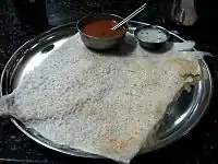 The ubiquitous Indian dish dosa has its origins in Udupi, according to P. Thankappan Nair.[3] Saaru, a spicy pepper water, is another essential part of the menu, and so are jackfruit, colocasia leaves, raw green bananas, mango pickle, red chillies, and salt. Adyes (dumplings), ajadinas (dry curries or stir fry curries), and chutneys, including one made of the skin of the ridge gourd, are specialities.[4]