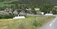 The Ulnes Bridge (Norwegian: Ulnes bru) is a road bridge in the municipality of Nord-Aurdal in Innlandet county, Norway. The bridge crosses Stronda Fjord at Ulnes, just northwest of Ulnes Church, and it is a branch of Norwegian County Road 261 connecting it to European route E16.[1][2] The bridge was opened on June 20, 2003. It is a wooden bridge with three spans of 35 meters (115 ft) each, creating a total length of 105 meters (344 ft).[3] The new wooden bridge replaced an older concrete bridge from 1932 that was narrow and in poor condition.