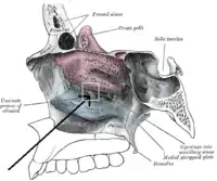 Lateral wall of nasal cavity, showing ethmoid bone in position.(Uncinate process of ethmoid labeled at left.)
