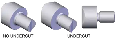 On turned parts an undercut is also known as a neck or "relief groove". They are often used at the end of the threaded portion of a shaft or screw to provide clearance for the cutting tool.
