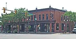 The Union Block is a two-story, six-bay, rectangular red brick Italianate commercial building. It measures 132 feet by 60 feet, and occupies a corner lot, fronting directly onto the sidewalk. Bays are divided by brick pilasters topped by decorative capitals. The two sections of the building have slightly different windows and differing secondary cornice line. Three rectangular windows topped by brick hoodmolds and keystones are in each of the west two bays, while two rectangular windows topped by brick hoodmolds without keystones are in each of the east four bays. Dentillated brickwork and an ornamental bracketed cornice top the structure; the original secondary cornice has been removed.[2]