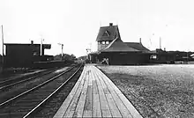 The level crossing of the two busy lines proved difficult to manage. After a fatal collision on February 16, 1881, the state Board of Railroad Commissioners recommended the junction be grade-separated.[6] Instead, the railroads chose to install less-costly automatic block signals to protect trains. A three-level interlocking tower was built on the east side of the junction in 1882.[6] (Use of signals to allow crossing other railroads at grade was first authorized by the state legislature that year.[9]) After debate in 1881–82, a union station was built in 1883 to serve both lines.[10] The station was designed by the chief engineer of the NY&NE and constructed for a cost of $10,000 (equivalent to $268,182 in 2022).[6][11] It had two wings to provide frontage on both railroad, forming a Y-shaped structure with the signal tower.[6][12]