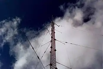 Folded unipole with only three skirt wires mounted off the corners of a standard triangular frame mast. (The close-in wire on the left side of the image is an incidental guy wire in the foreground.)