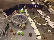 The National Transportation Safety Board (NTSB) is investigating the incident.[9] An NTSB structures engineer and two investigators from the NTSB's Denver office collected fallen debris with local law enforcement and safety agencies over several days immediately after the incident. Most of the structure from the inlet cowl and fan cowl doors that separated from the aircraft was recovered and identified. Recovered portions of the inlet cowl, fan cowl door structure, and inlet cowl attach ring were laid out in a hangar (pictured). The inlet cowl, fan cowl doors, and thrust reversers will be examined further by NTSB investigators to map damage and cowl failure patterns after the fan blade failure, and to examine the subsequent progression of fire in the thrust reversers.[25]