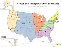 On January 1, 2013, the Census Bureau consolidated its twelve regional offices into six. Increasing costs of data collection, changes in survey management tools such as laptops and the increasing use of multi-modal surveys (i.e. internet, telephone, and in-person) led the Bureau to consolidate.[52] The six regional offices that closed were Boston, Charlotte, Dallas, Detroit, Kansas City and Seattle. The remaining regional offices are New York City, Philadelphia, Chicago, Atlanta, Denver, and Los Angeles.[53]