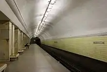 Universitet (Russian: Университе́т, English: University), named after the nearby Moscow State University, is a station on the Moscow Metro's Sokolnicheskaya Line. It opened in 1959 and has rectangular white marble pylons and tiled walls. The architects were V. Litvinov, M. Markovsky, L. Lile and V. Dobrakovsky. The station's two round entrance vestibules (architect Ivan Taranov) are located on either side of Prospekt Vernadskogo at Lomonosovsky Prospekt.
