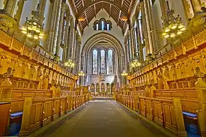The University Chapel was constructed as a memorial to the 755 sons of the university who had died in the First World War. Designed by Sir John Burnet, it was completed in 1929 and dedicated on 4 October. Tablets on the wall behind the Communion Table list the names of those who died, while other tablets besides the stalls record the 405 members of the university community who gave their lives in the Second World War. Most of the windows are the work of Douglas Strachan, although some have been added over the years, including those on the South Wall, created by Alan Younger.