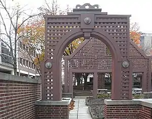 The archway is located on the east side of the plaza and is composed of wood, metal, and cast stone lion faces.[1] The wood is painted red and the woodwork is in a grid-like pattern. The outer perimeter is a square with an arch in the middle. There are three tiers that taper to the wavy wooden decoration at the top. Three lion faces are located on the front of the archway, one on both the left and right side and the third centered above the arch. It is located on a concrete and red brick base. Dimensions of the proper right base of the archway are 4’ in length, 2’ in width, and 3’ tall. The proper left base of the archway extends out longer to 15’ in length, 2’ in width, and 3’ tall. The archway itself has the dimensions of 2.5’ in length, 1’ in width, and 11’ tall (to the top of the final tier). All three lion faces are circular and the same size, measuring about 6” in diameter.
