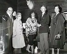 At left, former pastor (1928–30) at the Meeting House Augustus Benedict at a reception for him in 1988; Terrance Lindall, second from right.